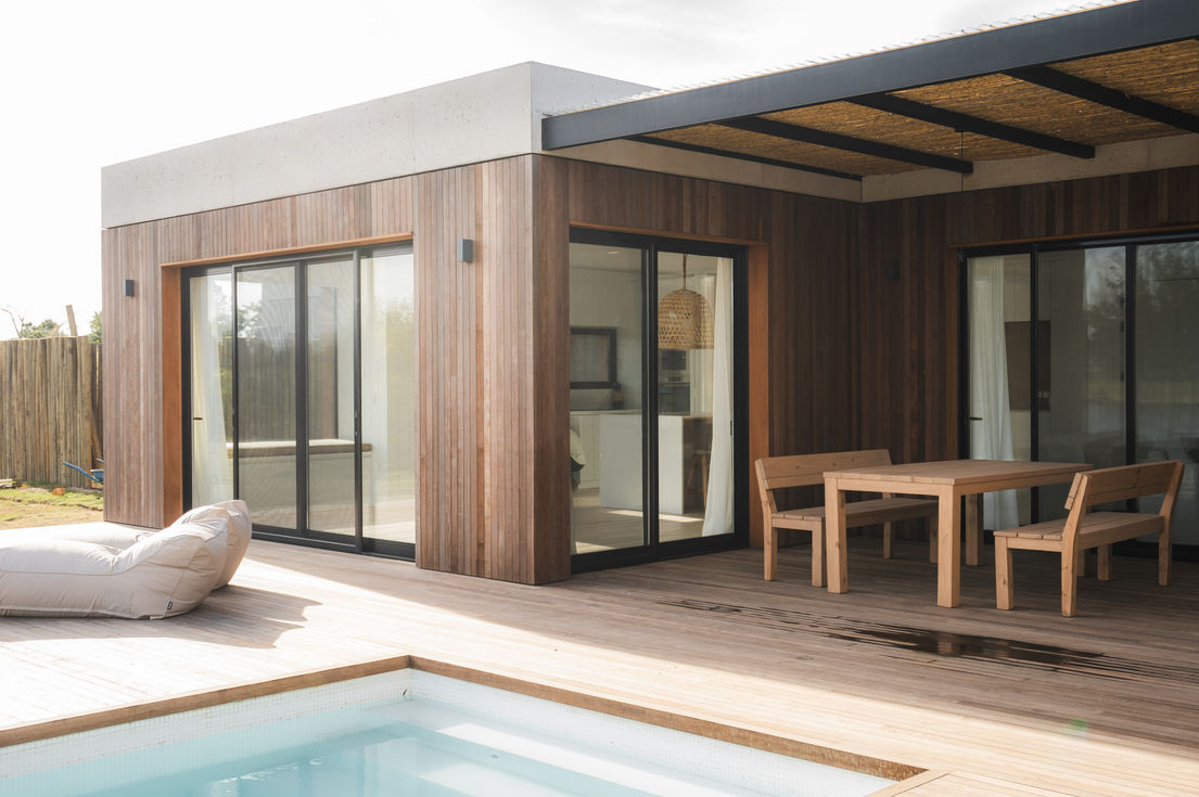 El proyecto, desarrollado en una sola planta con tipología en “U”, cuenta con 3 dormitorios y una fuerte conexión entre los espacios interiores y el paisaje. Se trabajó con especial cuidado en los detalles constructivos, destacando el uso de madera natural en revestimientos y carpinterías, y el hormigón visto como gesto estructural y estético principal.